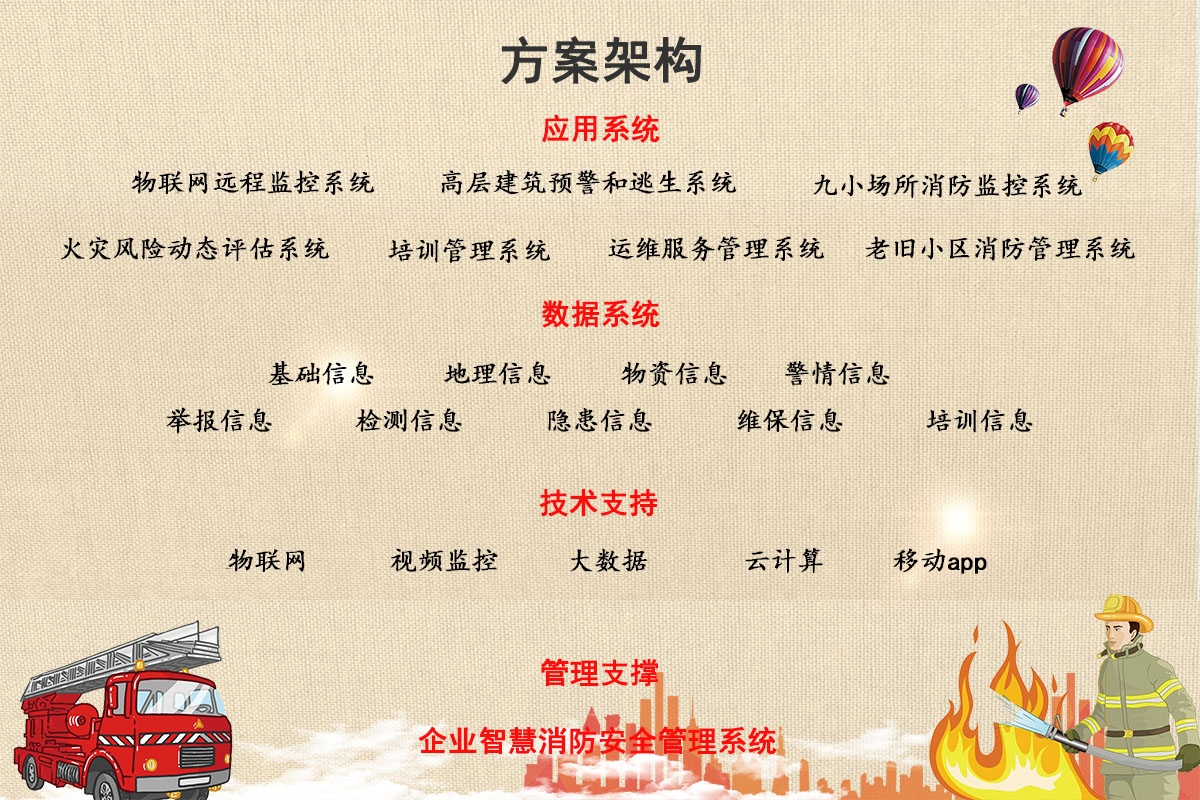 建设物联网消防远程监控系统和智能预警系统,实现动态感知、智能研判、精准防控,为消防提供信息支持。